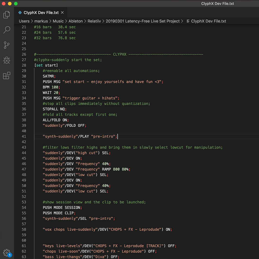 Here is a video where I am explaining the discussed concepts. I demonstrate commands in Ableton, show the ClyphX manual, and show parts of my ClyphX development file…